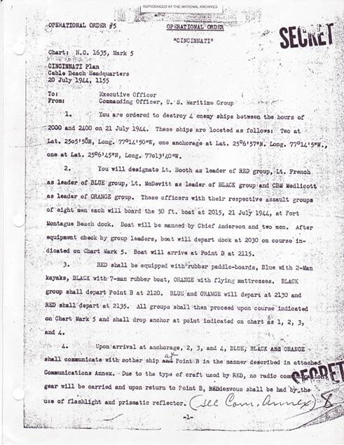 "Operation Cincinnati" was a full scale exercise conducted by Maritime Unit (MU) Operational Swimmer Group 2 (OSG 2) just after completion of team training in Nassau, Bahamas to test the harbor defenses of the Navy in Guantanamo Bay, Cuba and the Caribbean Theater. In addition to testing Navy defenses, these "exercises" were designed to test the effectiveness of the new Operational Swimmer Groups ability to conduct infiltration and sabotage operations by sea against an enemy before they were to deploy to the China, Burma, India Theater in the Fall of 1944.