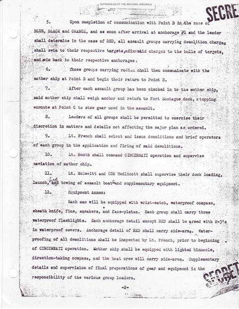 ...be equipped with wrist watch, waterproof compass, sheath knife, fins, sneakers, and face plates. Each group shall carry waterproof flashlights. Each anchorage detail...shall carry M-3's in waterproof covers. Anchorage detail of Red shall carry side-arms. Waterproofing of all demolitions shall be inspected by LT French (USMC)...[2]