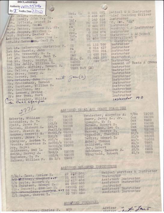 According to declassifed OSS Rosters from the "WA" Training Facitlity (West Coast Schools and Tarining WCTC), Coast Gaurd Lieutenant Commander Howard Shelby was Commanding Officer of Boats and Crews for the OSS. LCDR Shelby and approximately 50 other Coast Guard men worked hand in hand with the Army, Navy, and Marine Corps at the WCTC Facility's for Maritime Unit training. This model is essentially the first "joint training" operation during the War. (still under development 26 Jan 2008)
